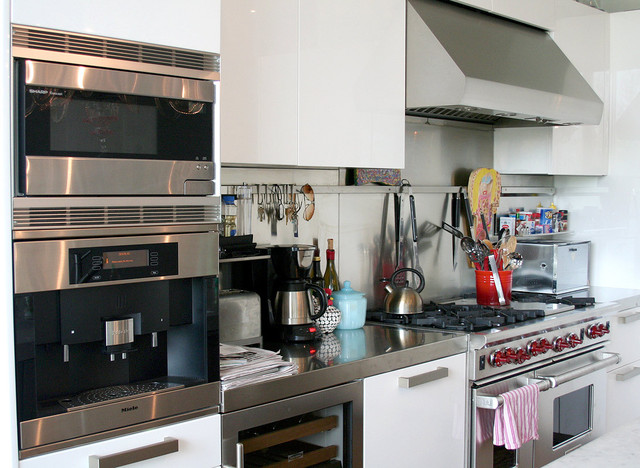 I've been watching "9 By Design" on Bravo tv pretty much every Tuesday night since it premiered and I am soooo in love with Cortney & Robert's kitchen! Seriously, they have my dream kitchen, all white, built-in automatic coffee maker, gorgeous wood floors (or are they??) and cool dining table & chairs. For those of YOU who don't know these two, (rob & cortney), they're the famous husband & wife design team known as Sixx Design. Apartment Therapy's the Kitchn featured their kitchen yesterday & I wanted to share a few of the shots with you.